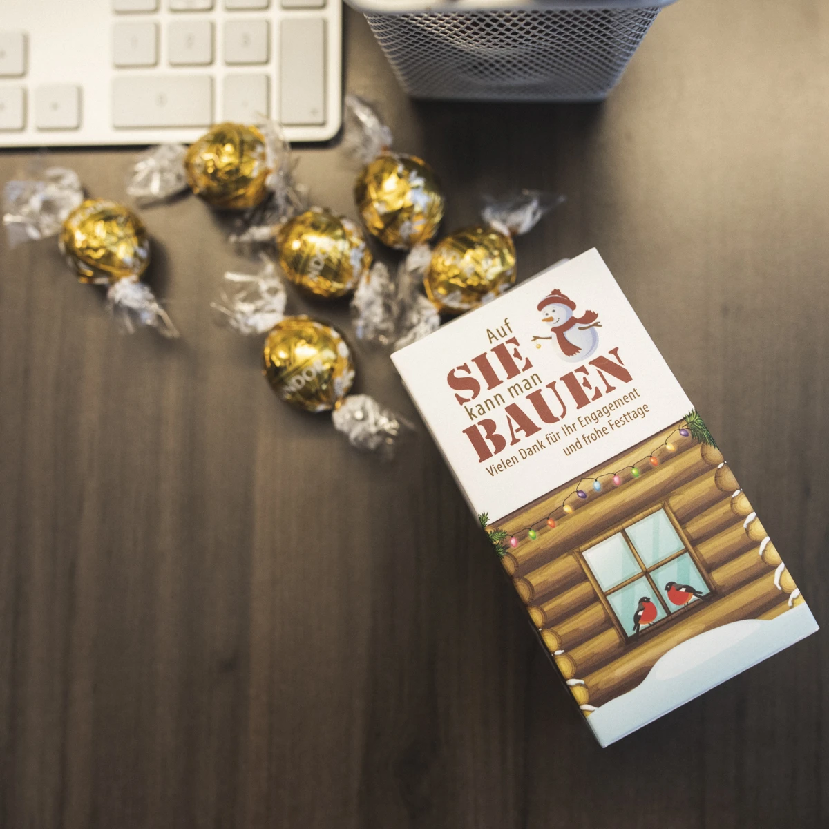 - Aufdruck: „Auf Sie kann man bauen – Vielen Dank für Ihr Engagement und frohe Festtage“