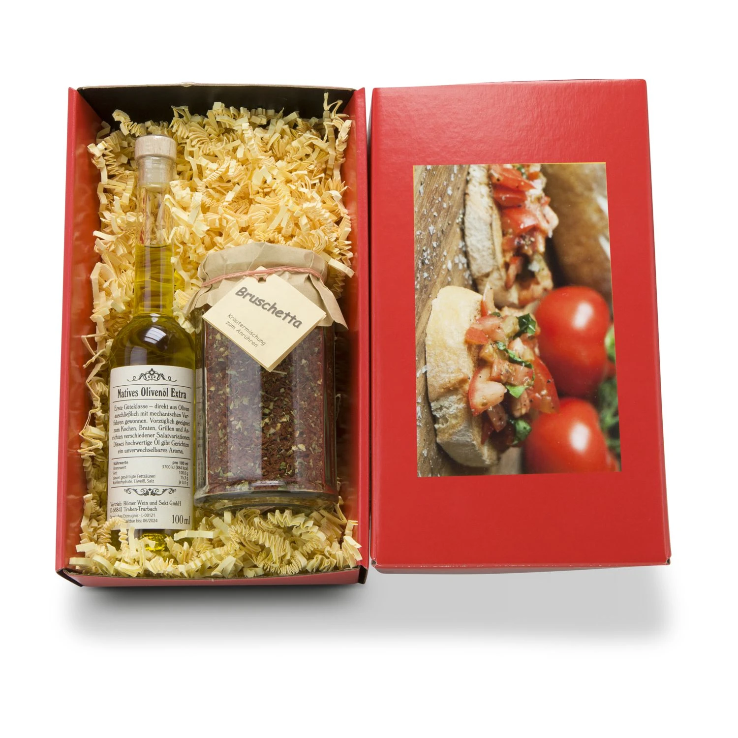 Bruschetta selbst zubereiten – kein Problem mit der Gewürzmischung (80 g) und der Flasche Natives Olivenöl Extra (100 ml). Der Deckelaufkleber auf dem farbigen Geschenkkarton macht gleich Appetit!
