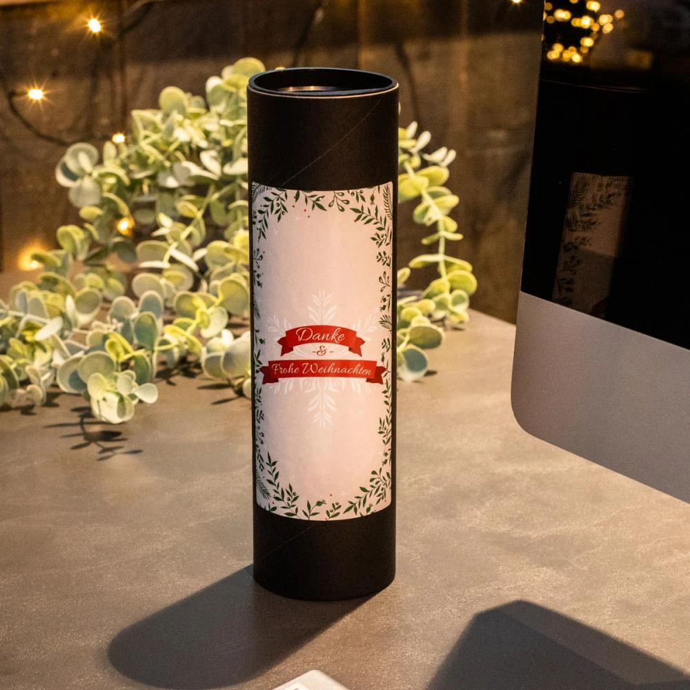 Wir machen zu Weihnachten außerdem das Unmögliche möglich und individualisieren auf Wunsch jede Hülse ab 1 Stück mit Namen und Eurem Logo. Das Etikett lässt sich auch an Eure Firmenfarben anpassen. Eine Karte und ein komplettes Geschenkset sind optional ebenfalls erhältlich.