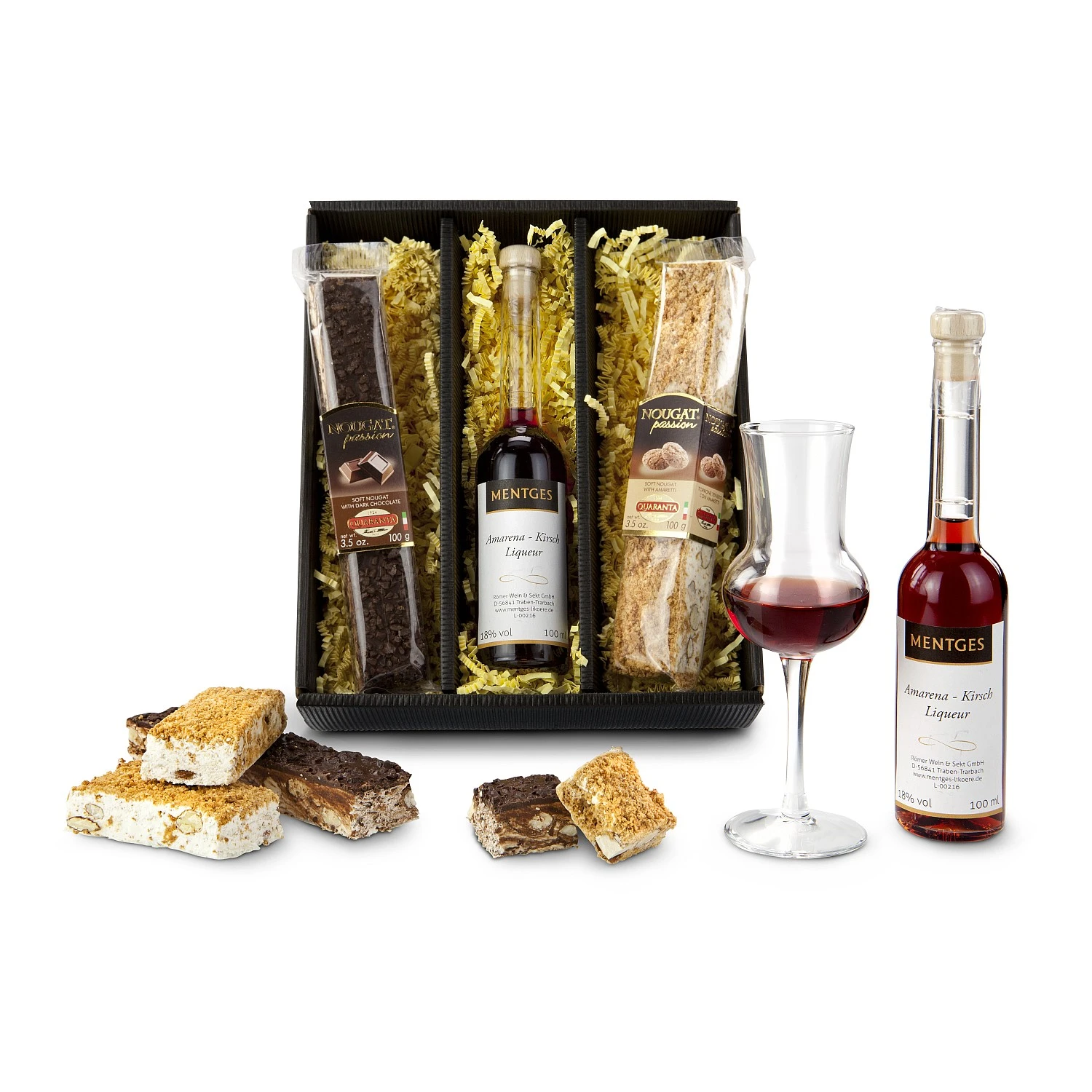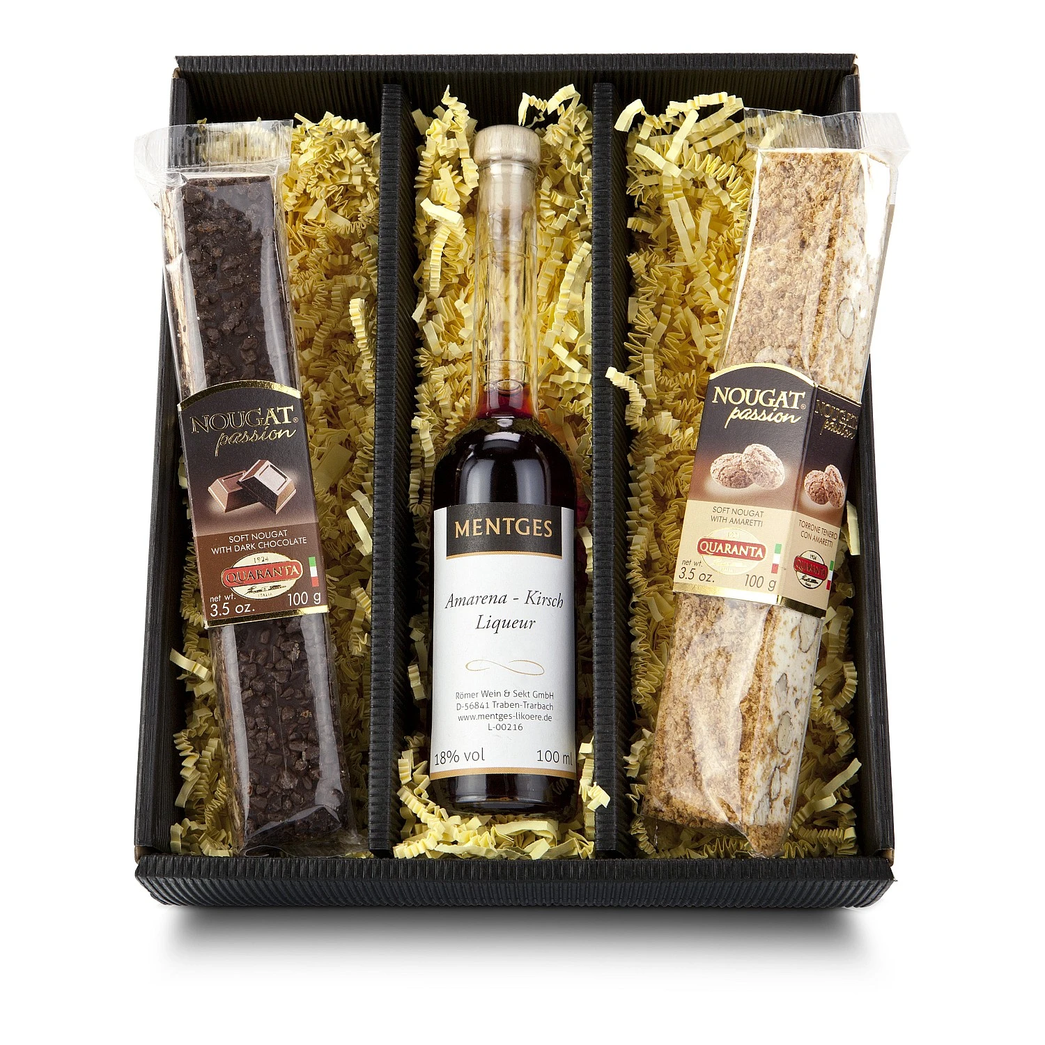 Ein Set zum Dahinschmelzen! Zwei Stangen Sofficione (italienischer Soft Nougat mit Mandeln) in den verführerischen Sorten Amaretti und Haselnusscreme (je 100 g) und ein fruchtiger MENTGES Amarena Kirsch-Liqueur (100 ml). In schwarzem Geschenkkarton mit Klarsichtdeckel.