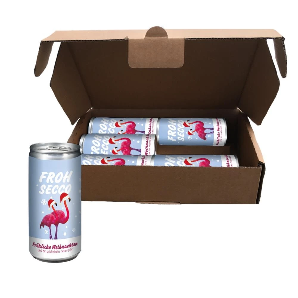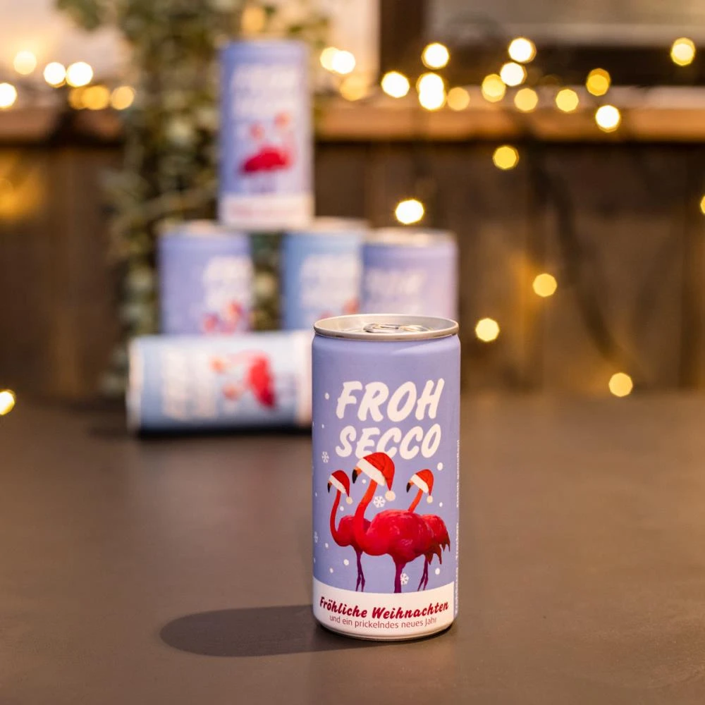 Mit „FrohSecco“ verschenkst Du 6 Mal einzigartig prickelnde Weihnachtsfreude. Der Secco in der 200 ml Dose ist eine weihnachtlich sympathische Aufmerksamkeit für Mitarbeiter, Kunden und Geschäftspartner.