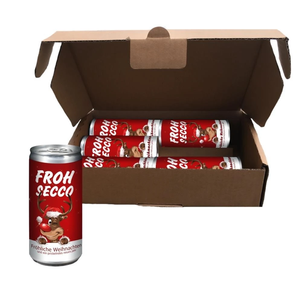 Mit „FrohSecco“ verschenkst Du 6 Mal einzigartig prickelnde Weihnachtsfreude. Der Secco in der 200 ml Dose ist eine weihnachtlich sympathische Aufmerksamkeit für Mitarbeiter, Kunden und Geschäftspartner.