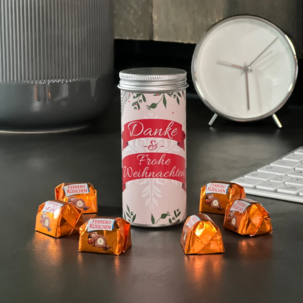 Dann haben wir genau das Richtige für Dich! Unsere praktische Geschenkdose mit Schraubdeckelverschluß ist gefüllt mit köstlichen Ferrero Küsschen und trägt eine Banderole mit der Botschaft „Danke & frohe Weihnachten“. So zeigst Du Deinen Crewmitgliedern, dass sie einen wertvollen Beitrag zum Erfolg des Unternehmens leisten und dass ihre Arbeit nicht unbemerkt bleibt.