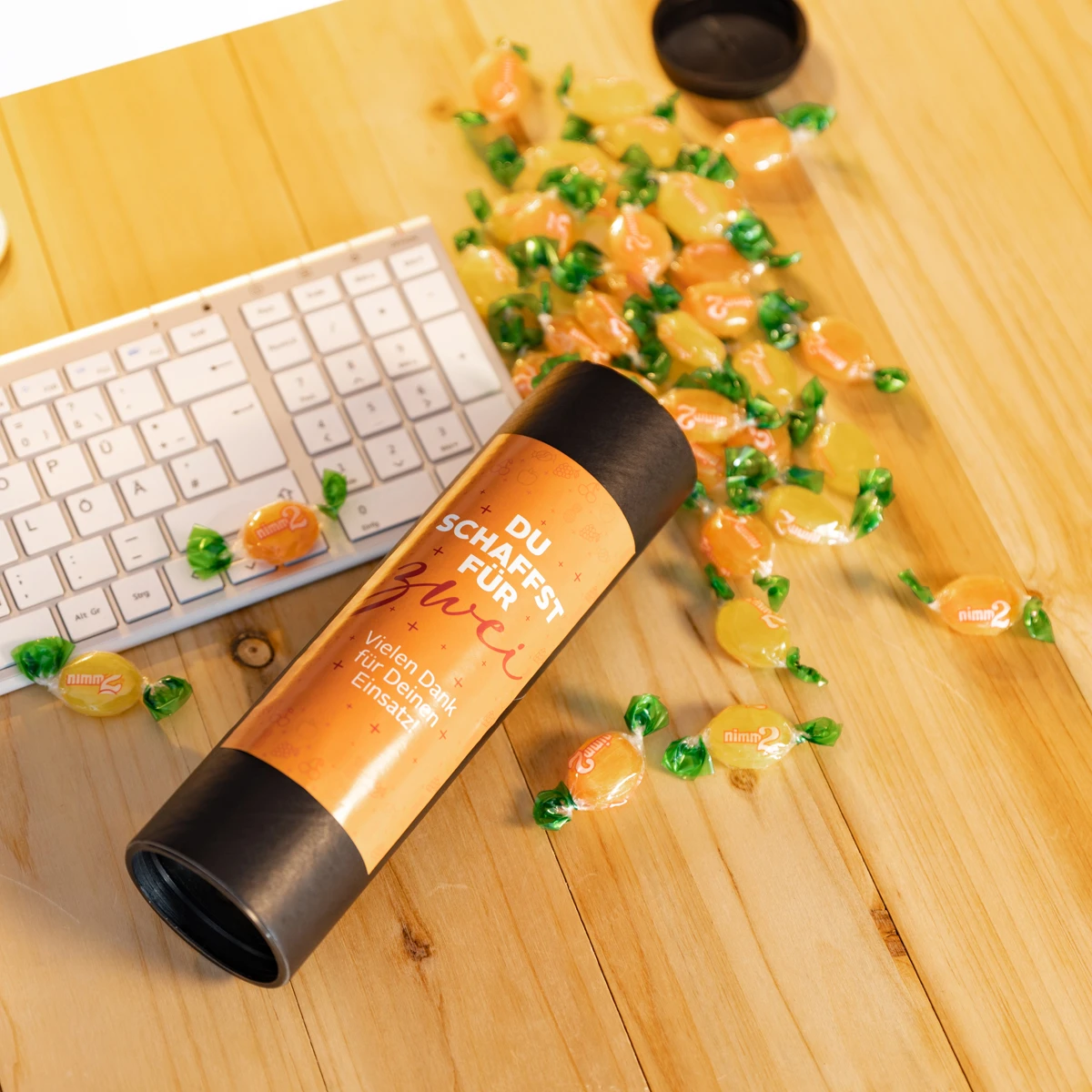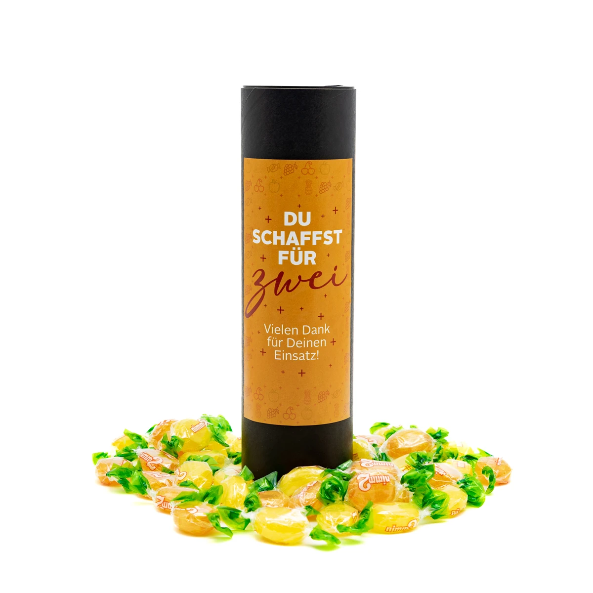 Du bist begeistert wie engagiert und motiviert Deine Mitarbeiter arbeiten und möchtest ihnen dafür ein Dankeschön aussprechen? Dann nutze unsere hochwertige, schwarzmatte Geschenkhülse und sage Danke mit dieser besonderen Botschaft: „Du schaffst für zwei – Vielen Dank für Deinen Einsatz!“. Das farbenfrohe Design und der leckere Inhalt zaubern Deinen Mitarbeitern ein Lächeln ins Gesicht und zeigen ihnen gleichzeitig, dass Du sie und ihre Arbeit wertschätzt. Gerne machen wir Deinen Gruß noch persönlicher: Wir bedrucken auf Wunsch das Etikett der Geschenkhülse mit Namen und Eurem Logo. Nutze auch unseren praktischen Logistik-Service: Wir lagern für Euch und schicken pünktlich zum besonderen Tag nach Hause oder ins Unternehmen.