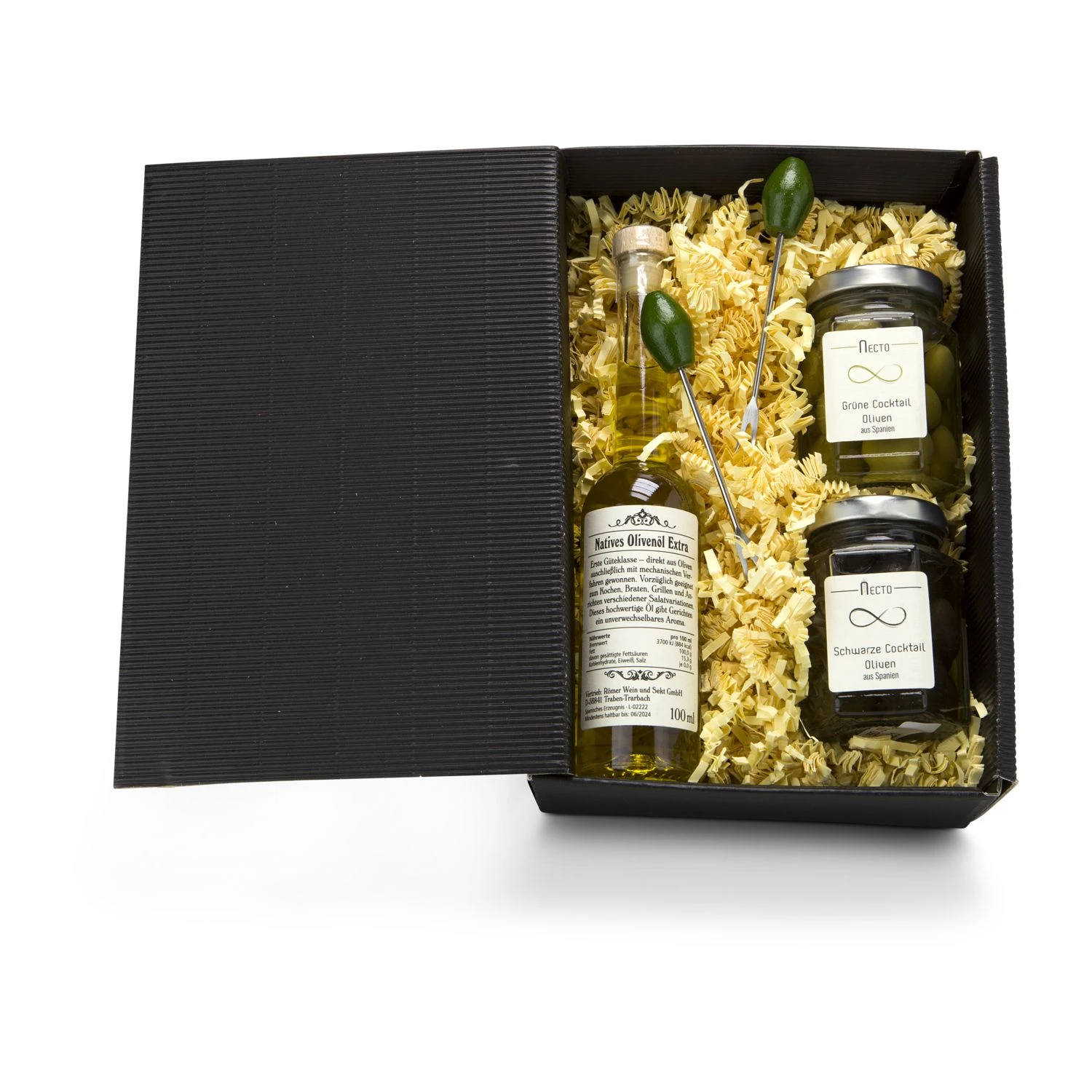 Oliven hoch Drei! 100 ml Natives Olivenöl Extra, 1 Glas grüne Oliven (15 g) und 1 Glas schwarze Oliven (15 g). Dazu 2 Olivenspieße, sodass Sie direkt aus den Gläsern snacken können. Alles ist verpackt in einem schwarzen Geschenkkarton mit Sizzle cream.