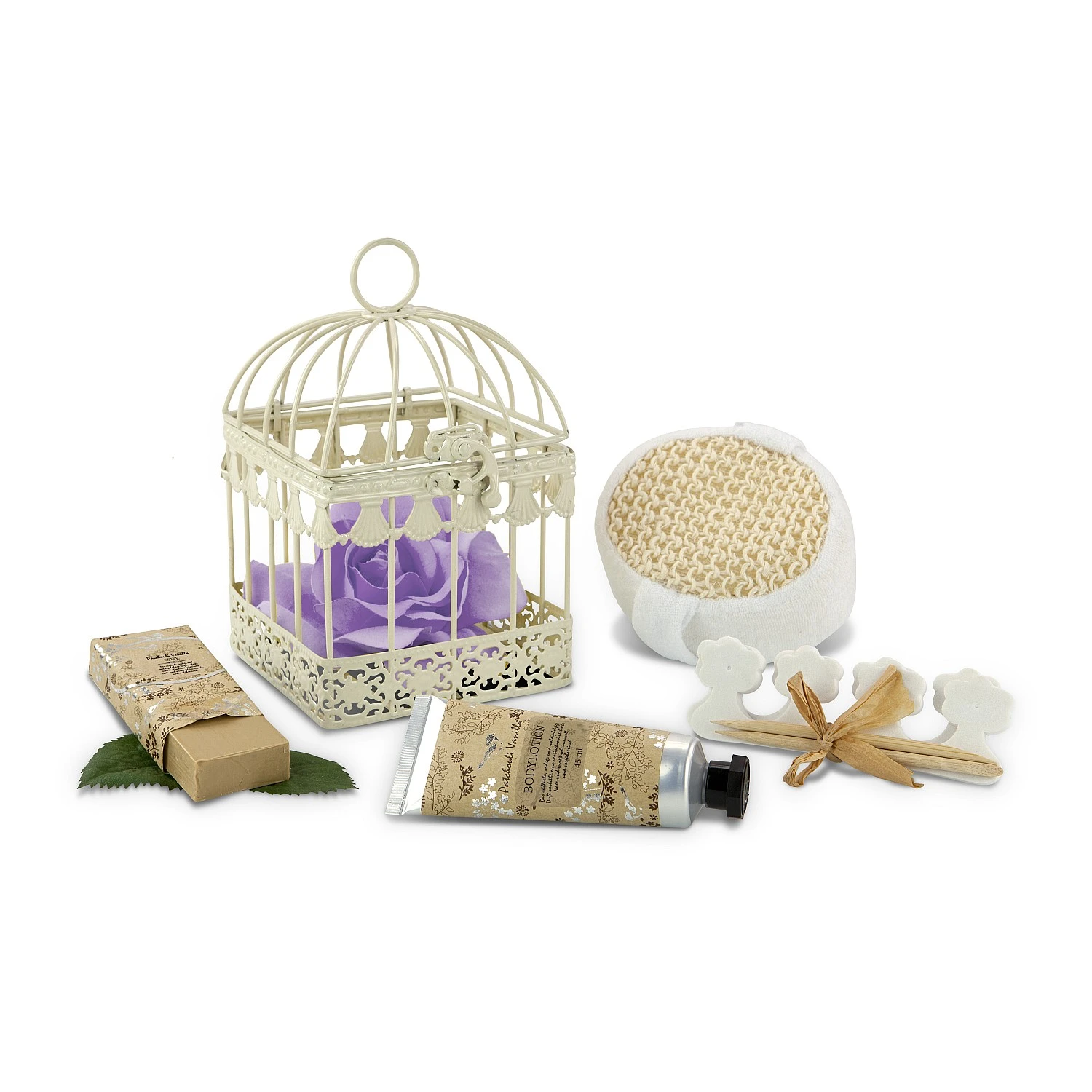 Ein kleiner dekorativer Käfig gefüllt mit Pflegeprodukten der Duftrichtung Patchouli Vanille für den ganz persönlichen Zen-Moment: 45 ml Bodylotion, ein Schwamm, 35 g Seife, 2 Zehentrenner und 2 Holzstäbchen. Der kleine, aufklappbare Metallkäfig sieht auch ohne den Inhalt sehr dekorativ aus, somit hat der Beschenkte gleich doppelt Freude.