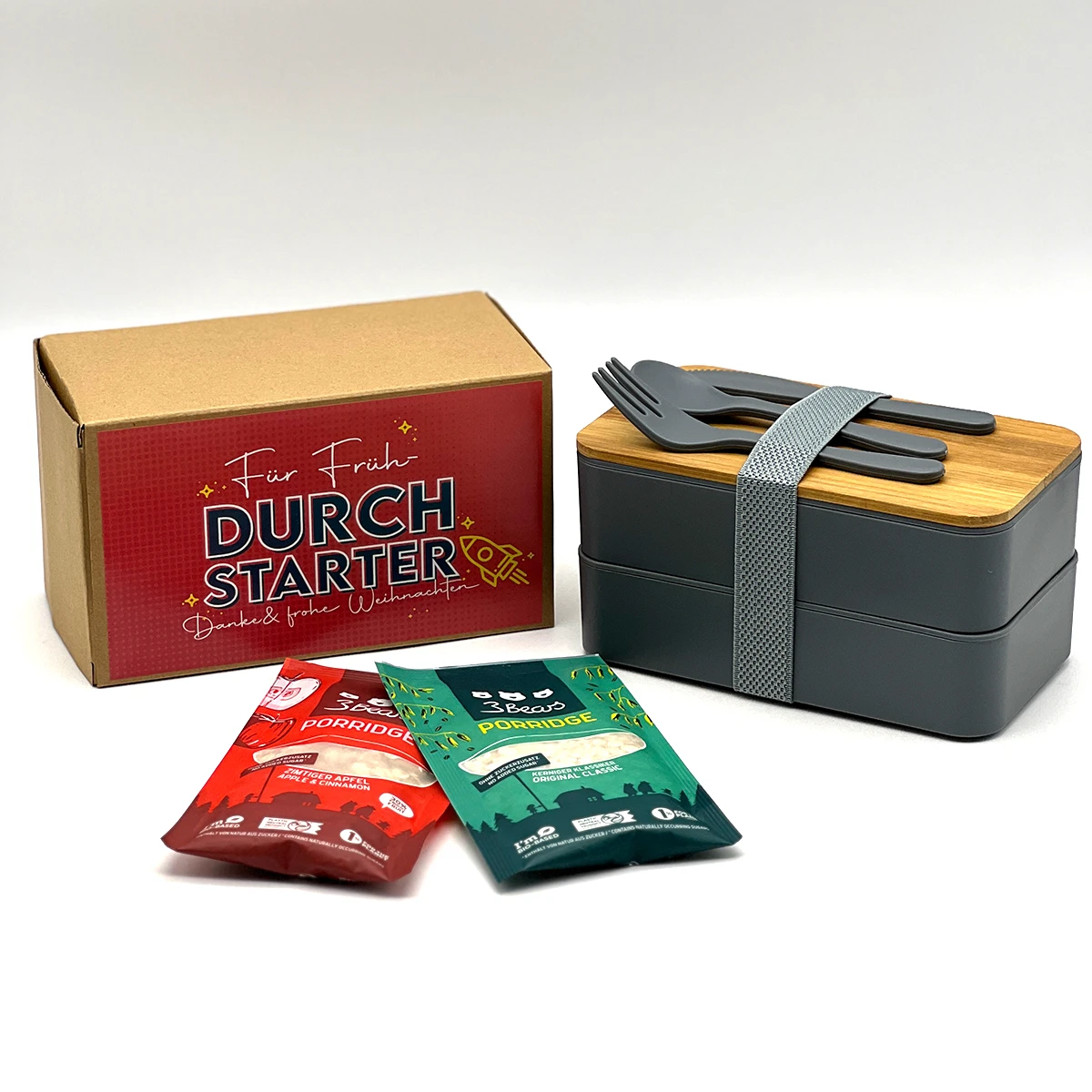 Dann haben wir genau das richtige Präsent für Deine Mitarbeiter und Kunden! Unsere Lunchbox ist ein Geschenk, das nicht nur praktisch, sondern auch liebevoll gestaltet ist. Die zweistöckige Box bietet genügend Platz für eine ausgewogene Mahlzeit und das mitgelieferte Besteck sorgt dafür, dass man auch unterwegs nicht auf Komfort verzichten muss. Der Bambusdeckel hält die Speisen frisch und verleiht der Lunchbox eine natürliche Note. Als besonderes Highlight haben wir die Lunchbox mit zwei Packungen Porridge von 3Bears gefüllt. Die Botschaft „Für Frühdurchstarter – Danke & frohe Weihnachten“ auf der Lunchbox rundet Deine Aufmerksamkeit perfekt ab. Zeige Deinem Mitarbeiter, dass Du seine Arbeit schätzt und ihm eine gesunde Mahlzeit für den Arbeitsalltag wünschst.