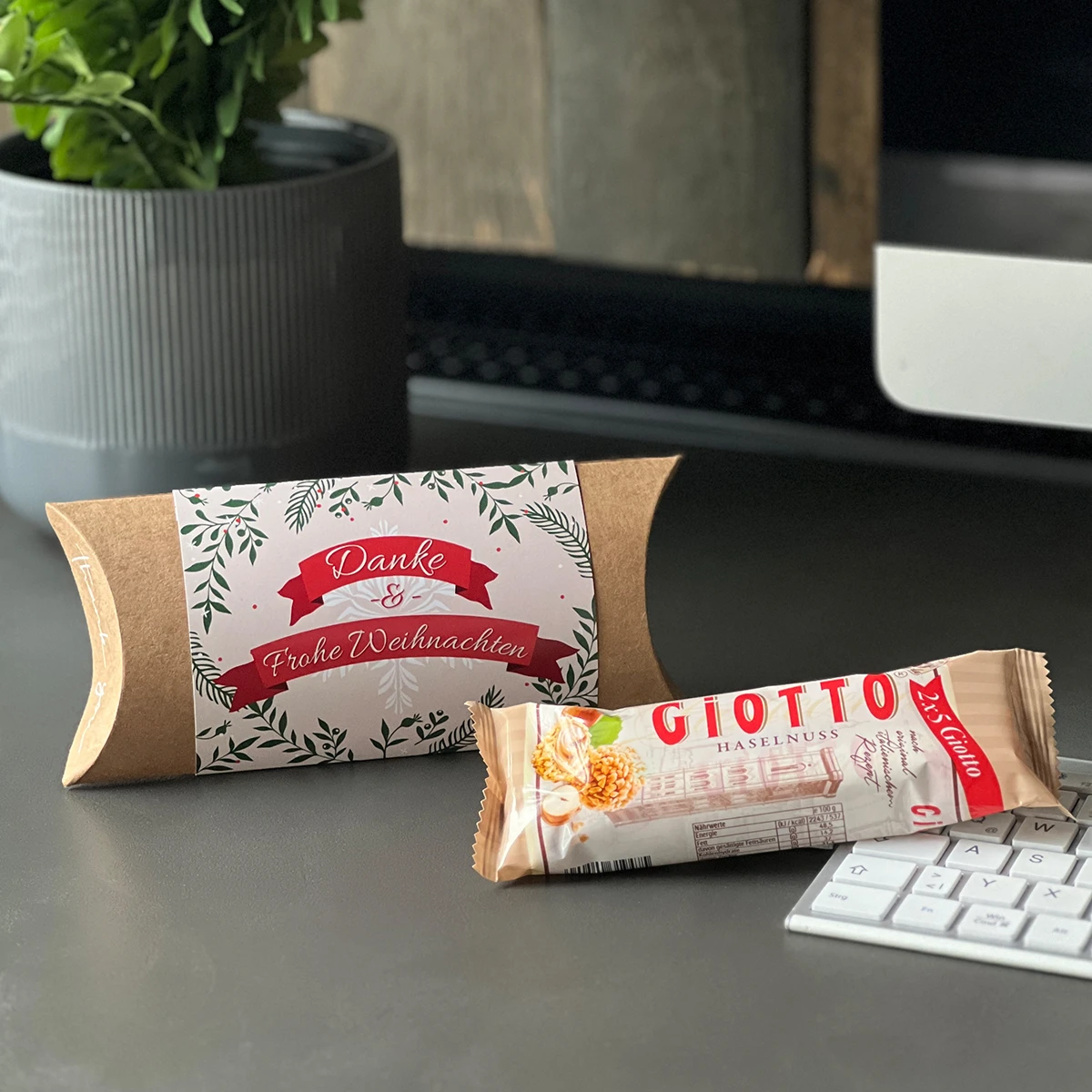 Dann haben wir genau das Richtige für Dich! Unsere exklusive Pillowbox, gefüllt mit köstlichen Giotto-Kugeln zeigt Deinen Mitarbeitern, dass sie einen wertvollen Beitrag zum Erfolg des Unternehmens leisten und dass ihre Arbeit nicht unbemerkt bleibt. Das Präsent wird durch die Botschaft „Danke & Frohe Weihnachten“ abgerundet und bringt Deine Wertschätzung auf ganz besondere Art und Weise zum Ausdruck.