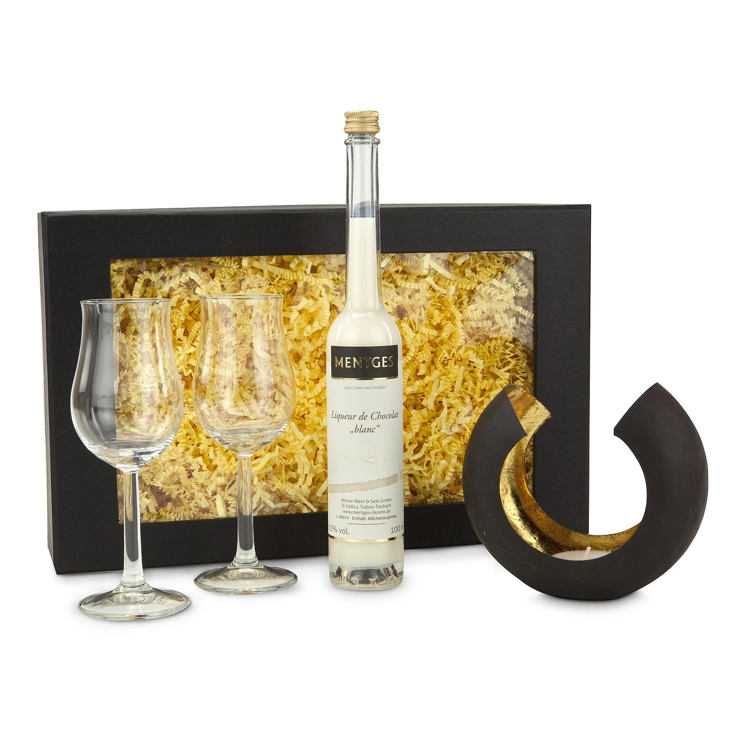 Eine wunderbare Kombination: Eine Teelichtschale ‘Sakrale’, die ein zauberhaftes Licht erscheinen lässt, ein 0,1 l Likör – wechselnde Sorten – und dazu passend 2 Likör-Gläser. Verschenken Sie mit diesem Set pure Entspannung – die schon durch das Sichtfenster zu sehen ist.