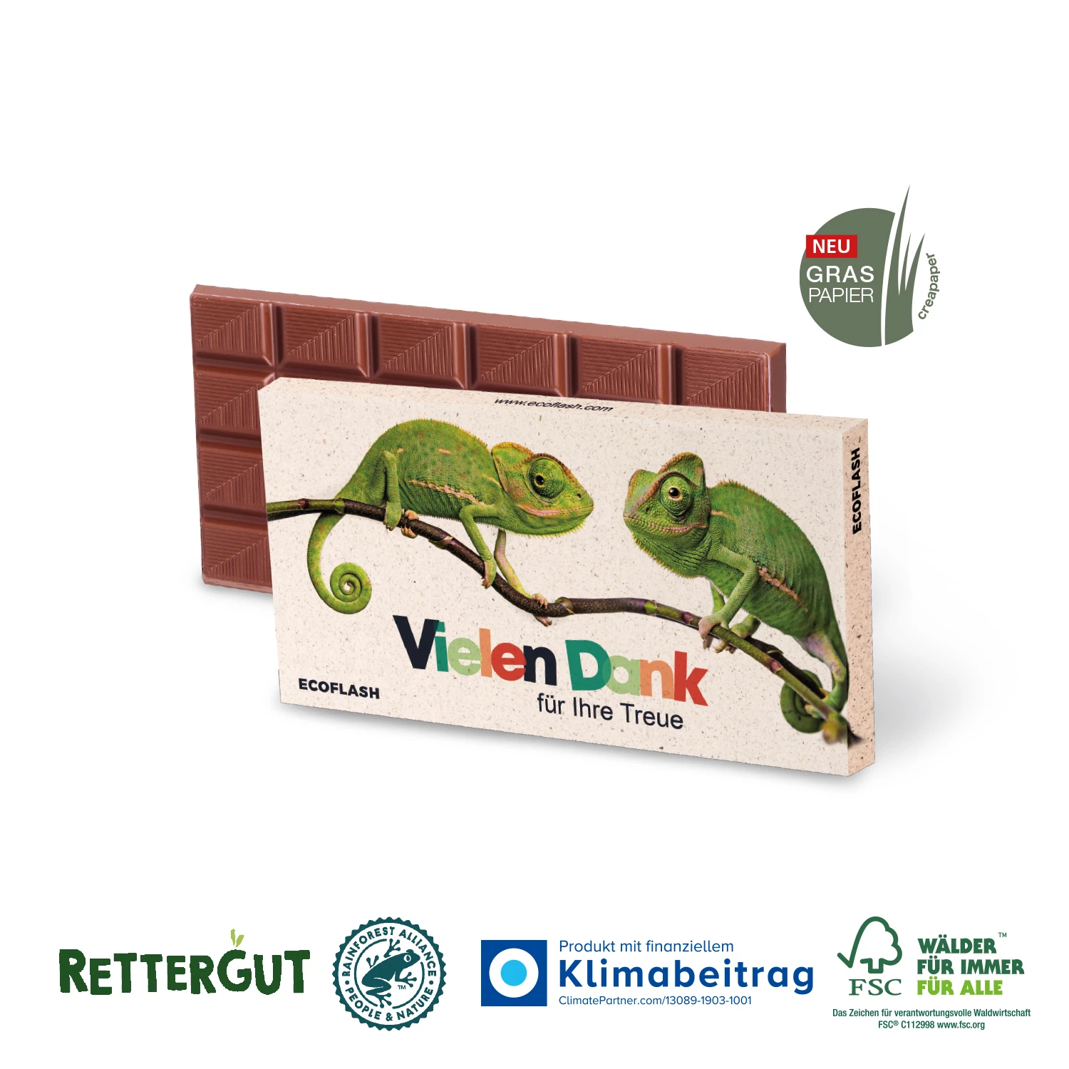 100 % Genuss, 100 % gerettet, fair produziert! Rettergut rettet die hochwertige Schokolade, die bei einem Sortenwechsel in der Produktion verloren ginge. Daraus werden Mixschokolade-Tafeln hergestellt