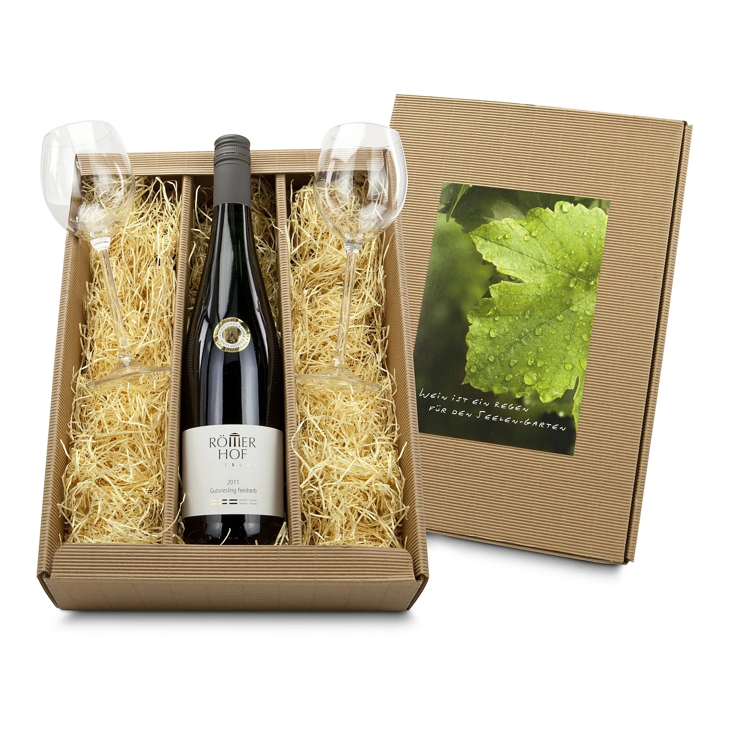 Riesling de luxe – ein wirklich passender Name für dieses Präsent: Eine feinherbe Mosel-Riesling Erzeugerabfüllung (0,75 l) vom mehrfach prämierten Weingut Römerhof und 2 Weingläser aus Kristallglas. Eine runde und stimmige Sache im naturfarbenen Geschenkkarton.