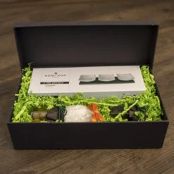 Hier bekommen Sie alles, was Sie für einen gemütlichen Abend mit einem leckeren Risotto benötigen: einen Chardonnay (0,75 l), eine Packung Bio Blitz-Risotto (250 g) von Reishunger und einen praktischen Topfuntersetzer für das heiße, dampfende Reisgericht. Der Topfuntersetzer aus Holz lässt sich platzsparend zusammenklappen. Verpackt ist alles in einem schwarzen Sichtfensterkarton mit roter Innenseite. Wir wünschen guten Appetit!