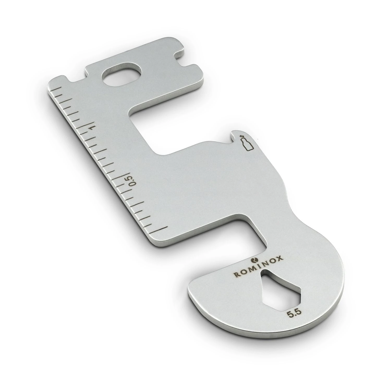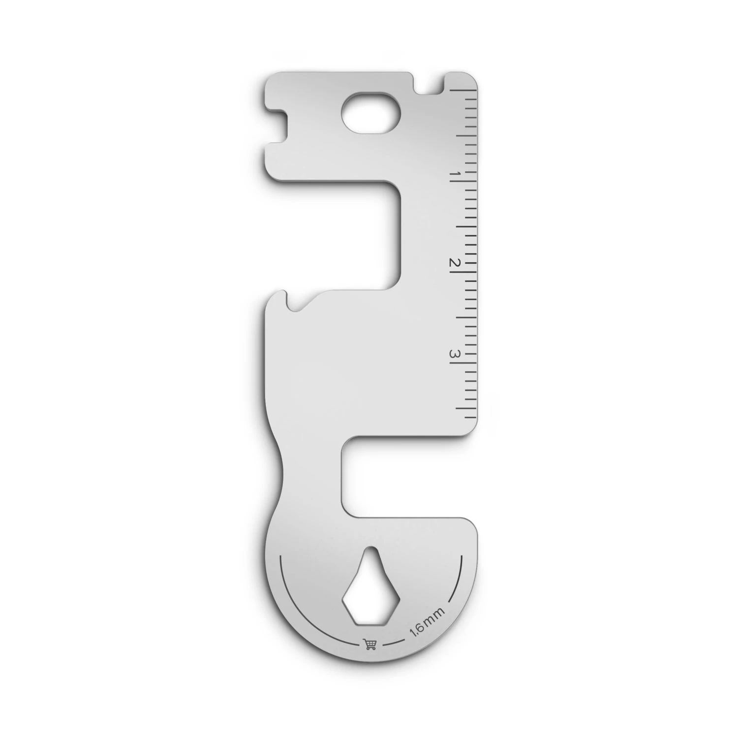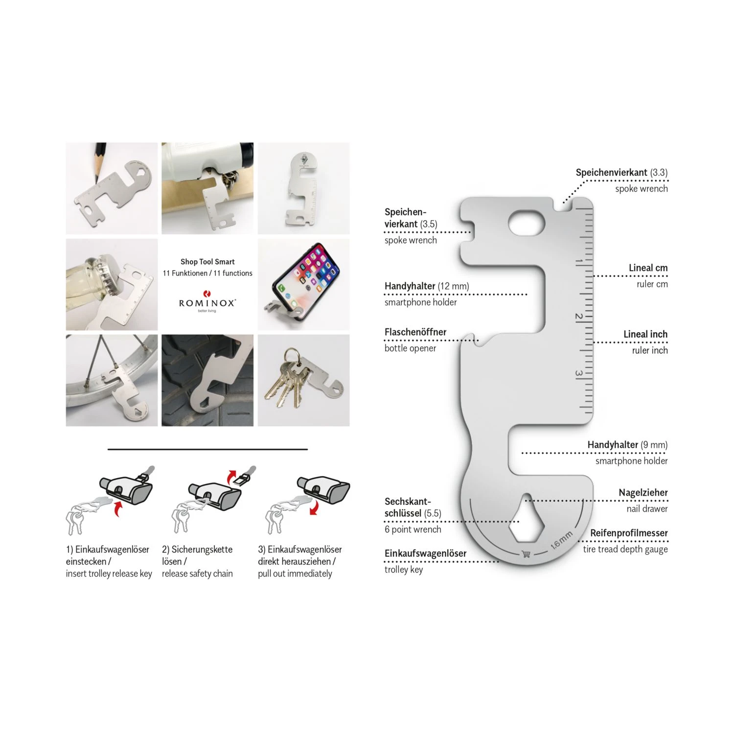 Die praktischen ROMINOX© Multitools gibt es jetzt auch als schlanke Einkaufswagenlöser für den Schlüsselbund! Klein, leicht und dennoch vielseitig, überzeugen die neuen Shop Tools im Alltag. Hergestellt aus robustem Werkzeugstahl, inklusive Funktionsbeschreibung und Standard-Kartonverpackung. Ab einer Bestellmenge von 100 Stück ist auch eine kundenindiviDuelle Verpackung möglich (Werkzeugstahl). Erhältlich in drei Designs. Das Shop Tool als Schlüsselanhänger verfügt über 11 Funktionen: 1 Einkaufswagenlöser, 1 Flaschenöffner, 1 Reifenprofilmesser (1,6 mm), 1 Nagelzieher, 2 Speichenvierkant, 1 Zentimeter Lineal, 1 inch Lineal, 2 Handyhalter, 1 Sechskantschlüssel. Ab einer Bestellmenge von 3.000 Stück ist auch eine SonderproDuktion mit indiviDueller Form möglich.