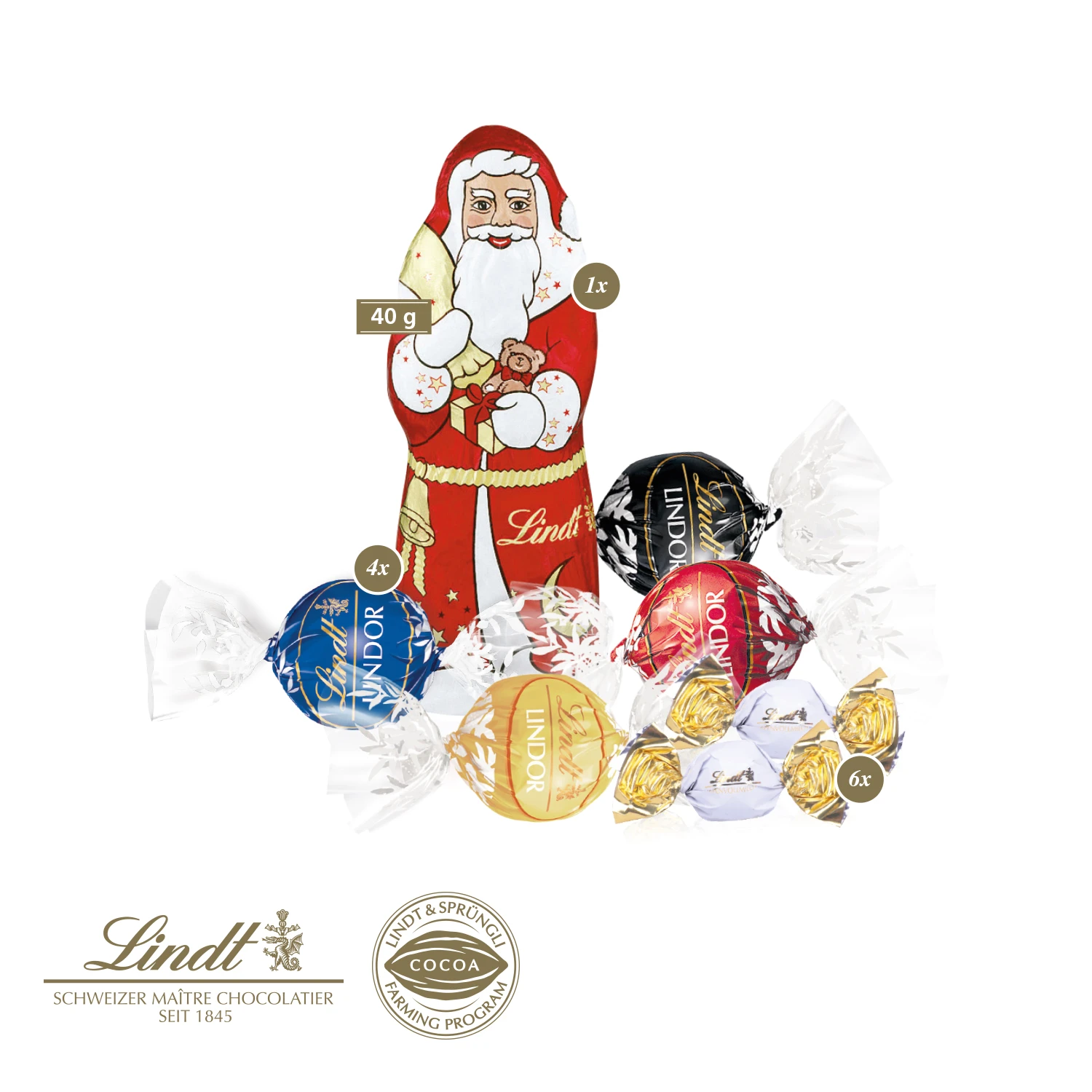 | Inhalt: | Schokoladenmischung von Lindt (ca. 125 g), bestehend aus: 5 Stück Lindt Pralinés „Lindor“, 5 Stück Lindt Vollmilchkugeln und einem zartschmelzenden Lindt Weihnachtsmann (40 g) |