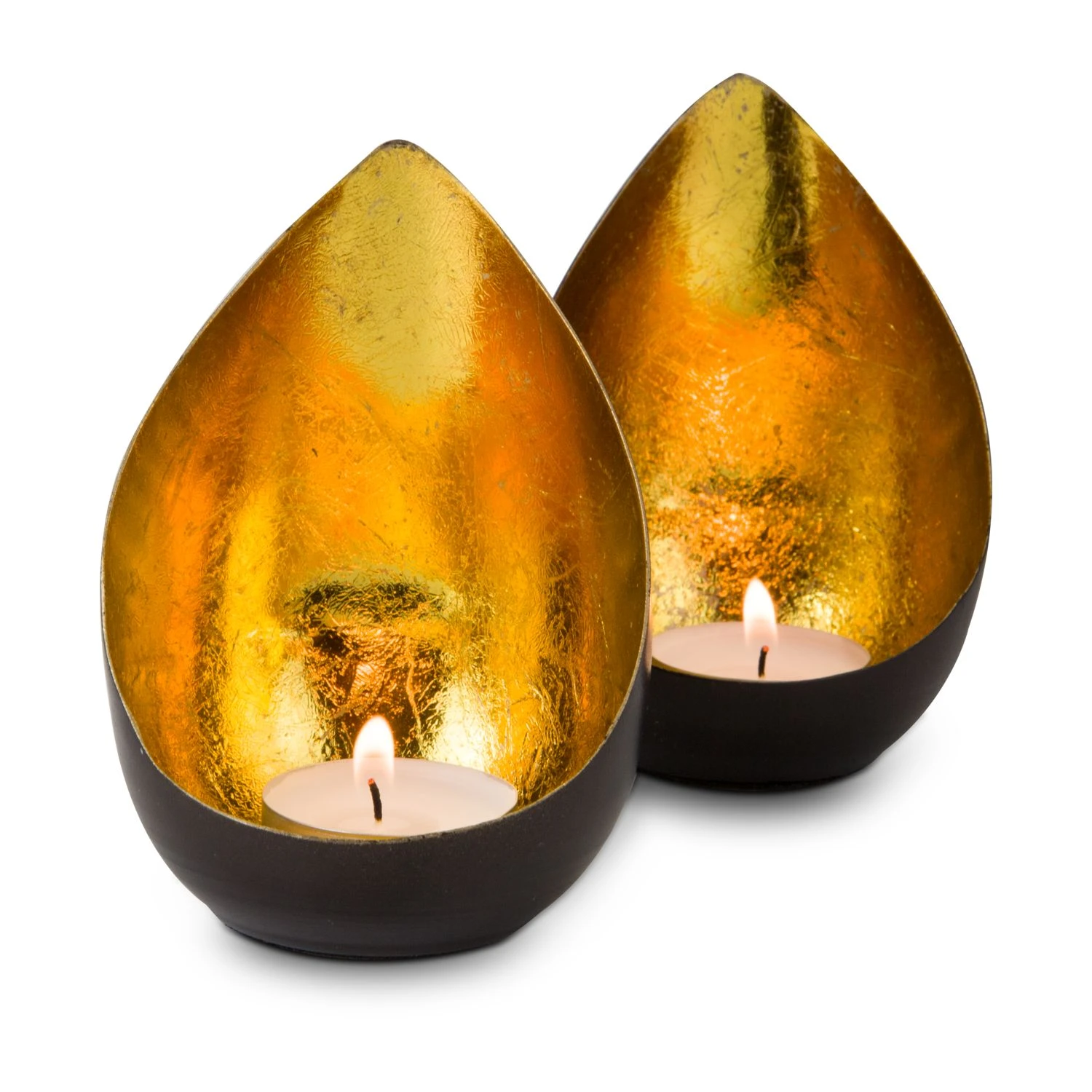 Zwei wunderschöne, dekorative Teelichthalter als harmonisches Set, goldene Lichteffekte für pure Entspannung (Metall – seidenmatt braun lackiert mit Goldfolienauskleidung, ohne Teelicht). Handarbeit bedingt leichte Formunterschiede. Auch in anderen Designs erhältlich.