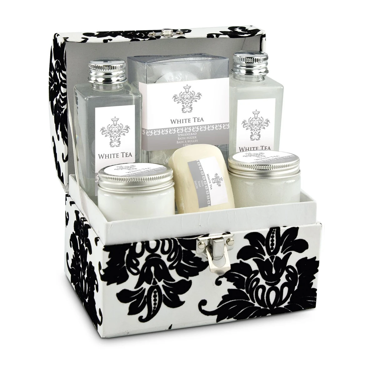 Der weiße Tee gilt als eldeste Tee-Sorte der Welt. Das Geschenkset „White Tea“ profitiert von seinem süß-lieblichen Aroma. Die Badezusätze – je 140 ml Duschgel und Schaumbad, je 60 ml Peeling und Bodylotion, 2 x 40 g Fizzer, 45 g Seife sind in einem dekorativen Köfferchen verpackt. Somit hat das Wellness-Set nicht nur einen pflegenden sondern auch dekorativen Nutzen.