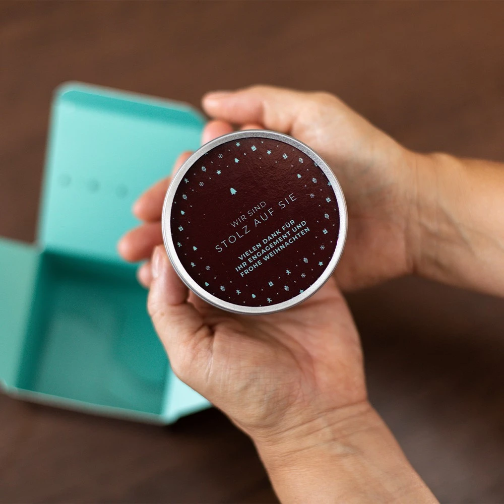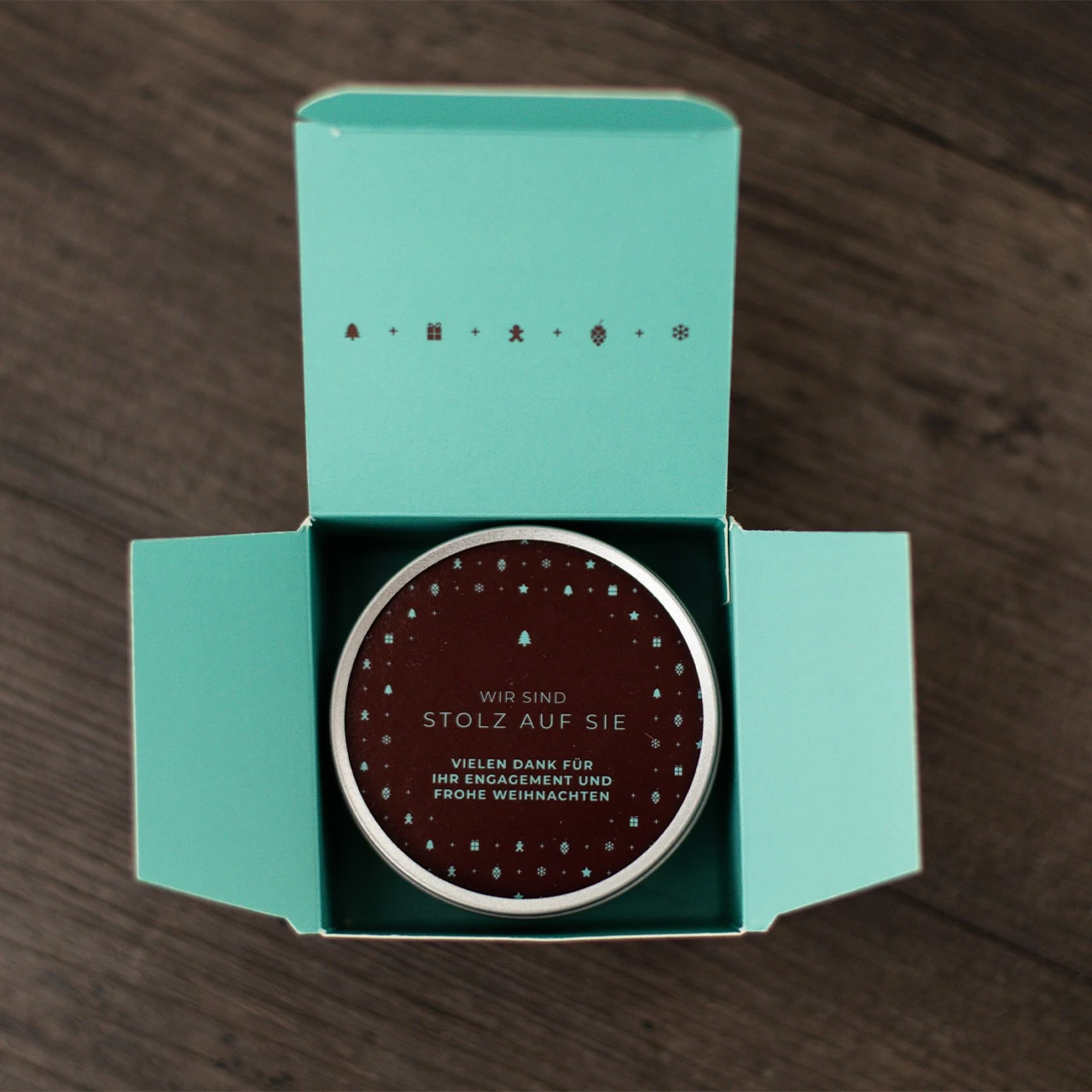 - Aufdruck: „Wir sind stolz auf Sie – Vielen Dank für Ihr Engagement und frohe Weihnachten“