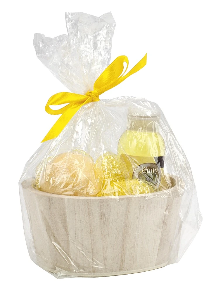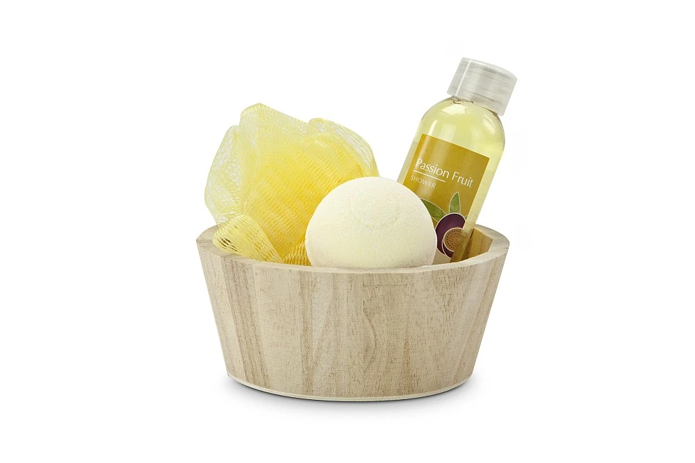 Behalten Sie die Balance! Das Wellness-Set „Yellow in Balance“ besteht aus einem Holzkörbchen mit 50 ml Duschgel, 1 Badekugel und einem Schwamm. Duftrichtung der Badezusätze ist Passionsfrucht. Die ideale kleine Aufmerksamkeit für Mann und Frau!