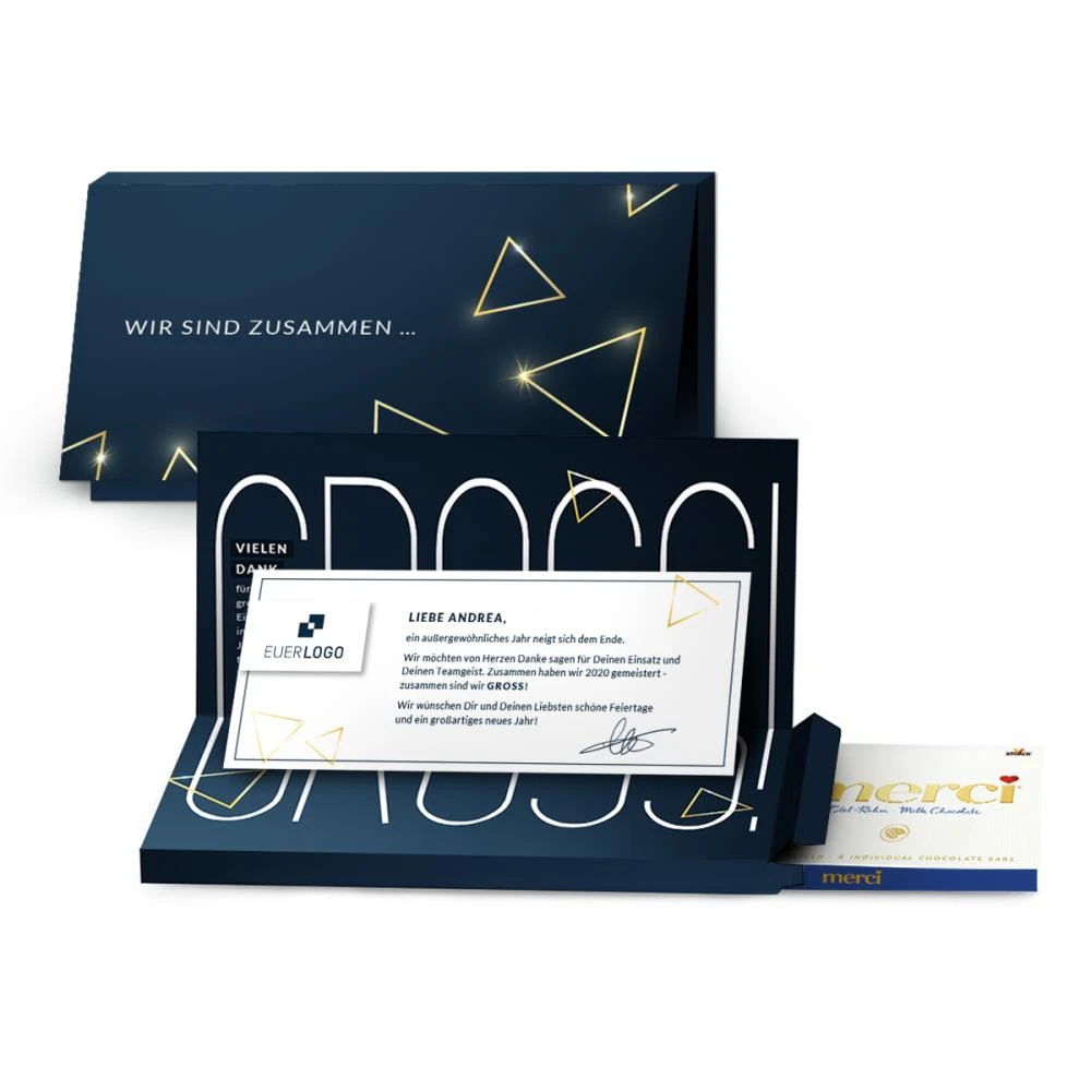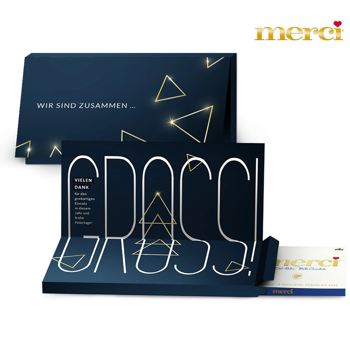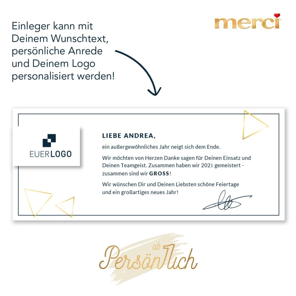 Eine außergewöhnliche Weihnachtsüberraschung und ein emotionales Dankeschön für ein gemeinsam erarbeitetes Jahr: Sage und zeige Deinen Mitarbeitern und Kunden, wie stolz und dankbar Du bist! In der originellen Verpackung zum Aufklappen versteckt sich passend zum Anlass köstliche Edel-Rahm „merci“ Schokolade (100g).